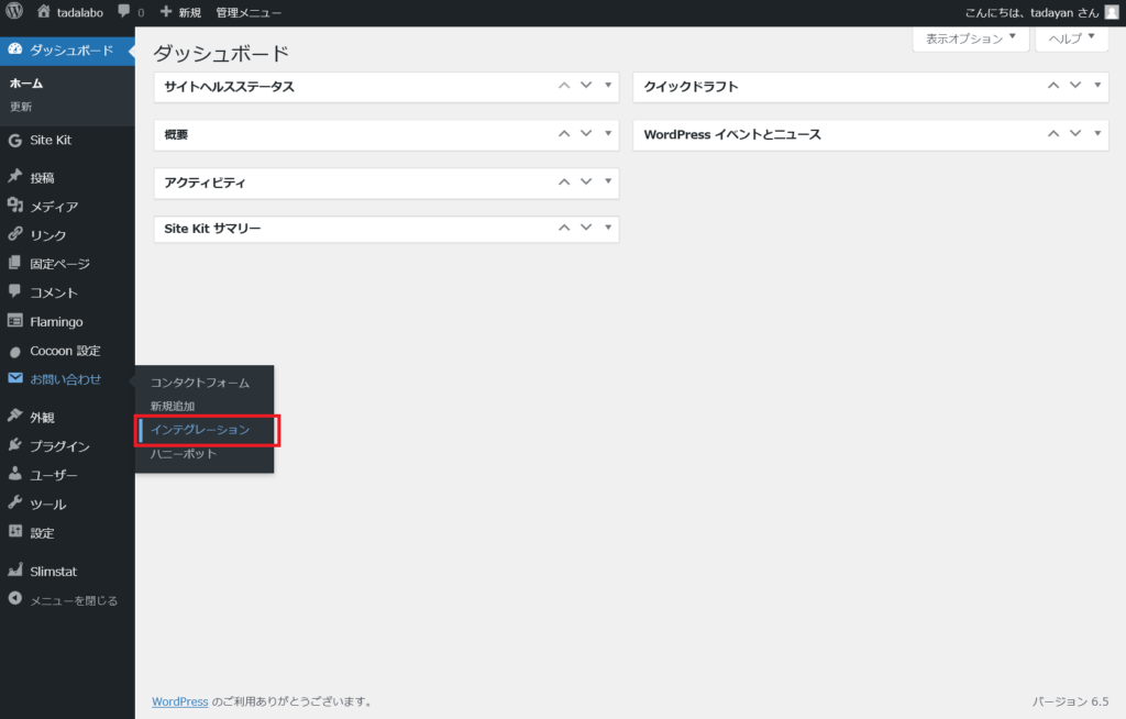wordpressの管理画面で「お問い合わせ->インテグレーション」をクリックする