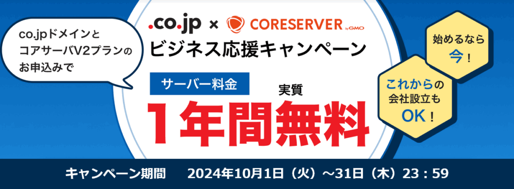 さらに、キャンペーン期間中に.co.jpドメインの登録 + コアサーバーV2プランの契約をし、必要事項を連絡するとサーバー料金1年間分*が全額キャッシュバックされます!