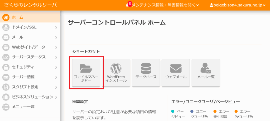 「サーバーコントロールパネル」で[ファイルマネージャー]ボタンをクリックします。