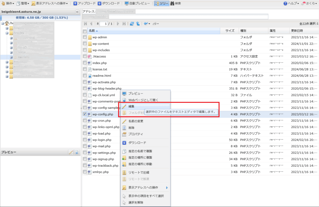 「wp-config.php」を右クリックし、『編集』をクリックします。