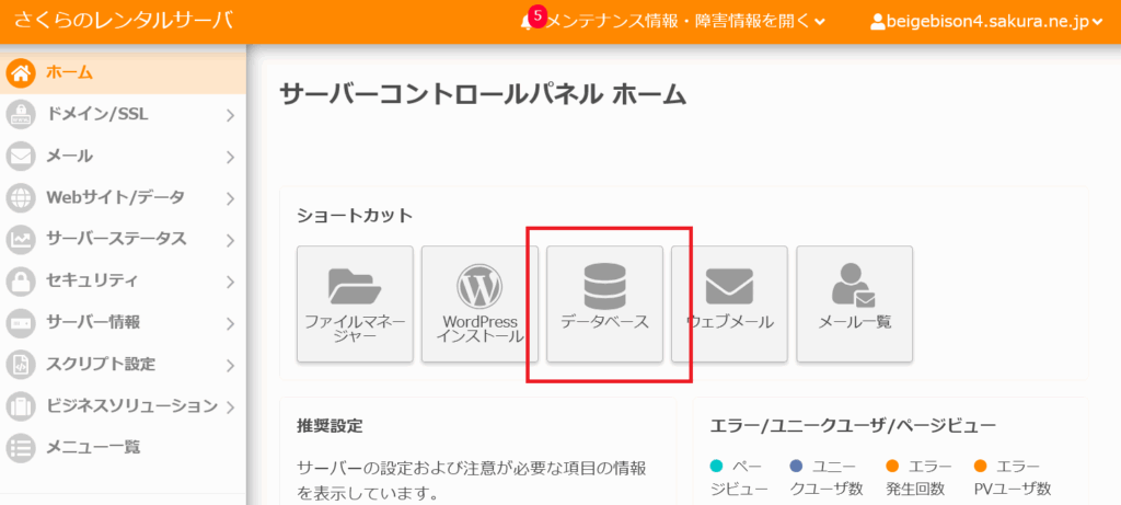 「サーバーコントロールパネル」で[データベース]ボタンをクリックします。